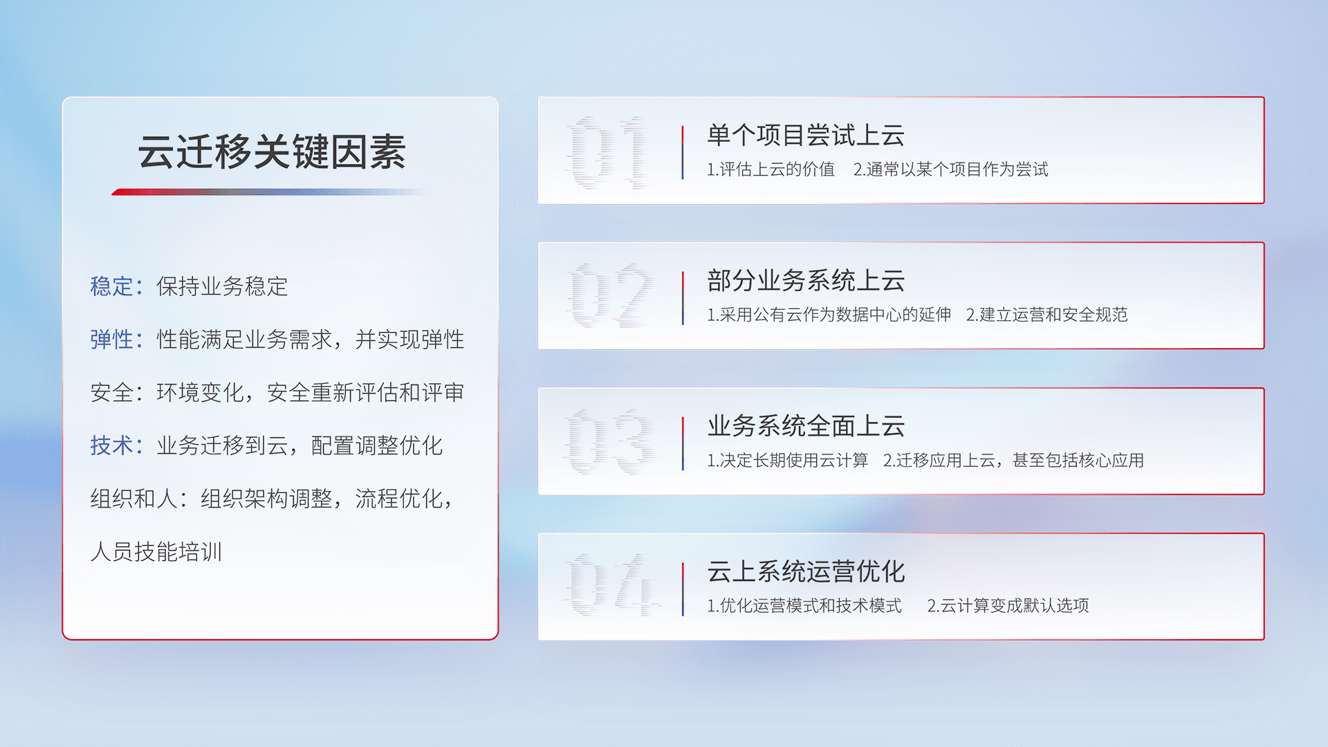 结合实际业务,,,,从规划设计、、、云平台选型、、、、云原生改造、、、数据迁移、、、集成交付,,,,迁移全过程为客户识别最佳上云路径,,做好风险识别管理,,,,设计网络架构、、、、身份权限、、、安全审计合规、、操作审计、、日志审计、、、监控告警策略、、、多站点容灾设计等,,,对云上基础设施进行整体规划,,,提升IT治理水平,,,以满足弹性、、、、高可用、、、高性能的需求。。