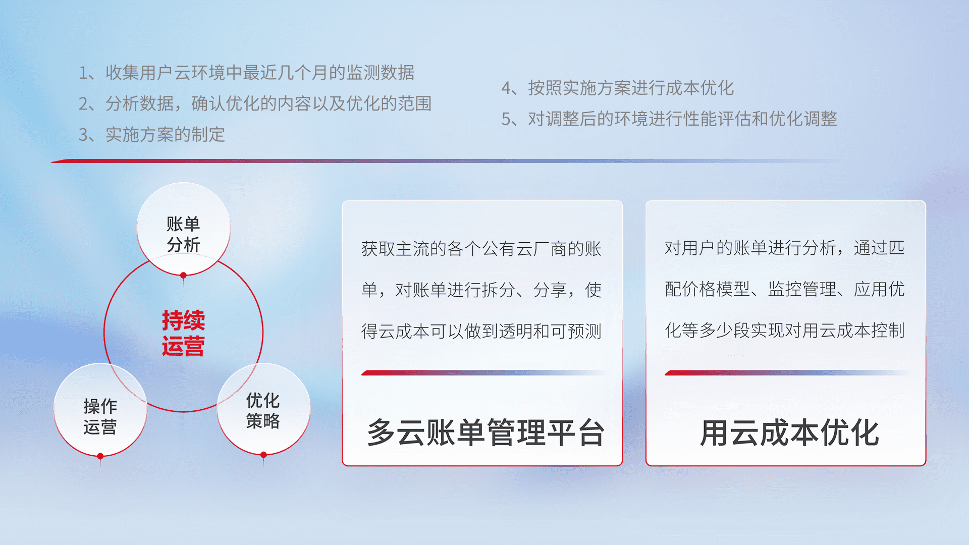 通过多云纳管,,以统一的资源数据模型把客户的云资源进行抽象和封装,,,,进而实现对多云资源的统一操作,,,,保障云资源管理的可靠性、、稳定性与可用性。。。量身定制化运维内容,,,配置、、、、开发运维、、补丁管理、、、备份、、、、监控、、、、认证和访问管理、、审计和日常巡检等,,,,保障在用云过程中的可靠度,,,稳定度以及高可用率。。