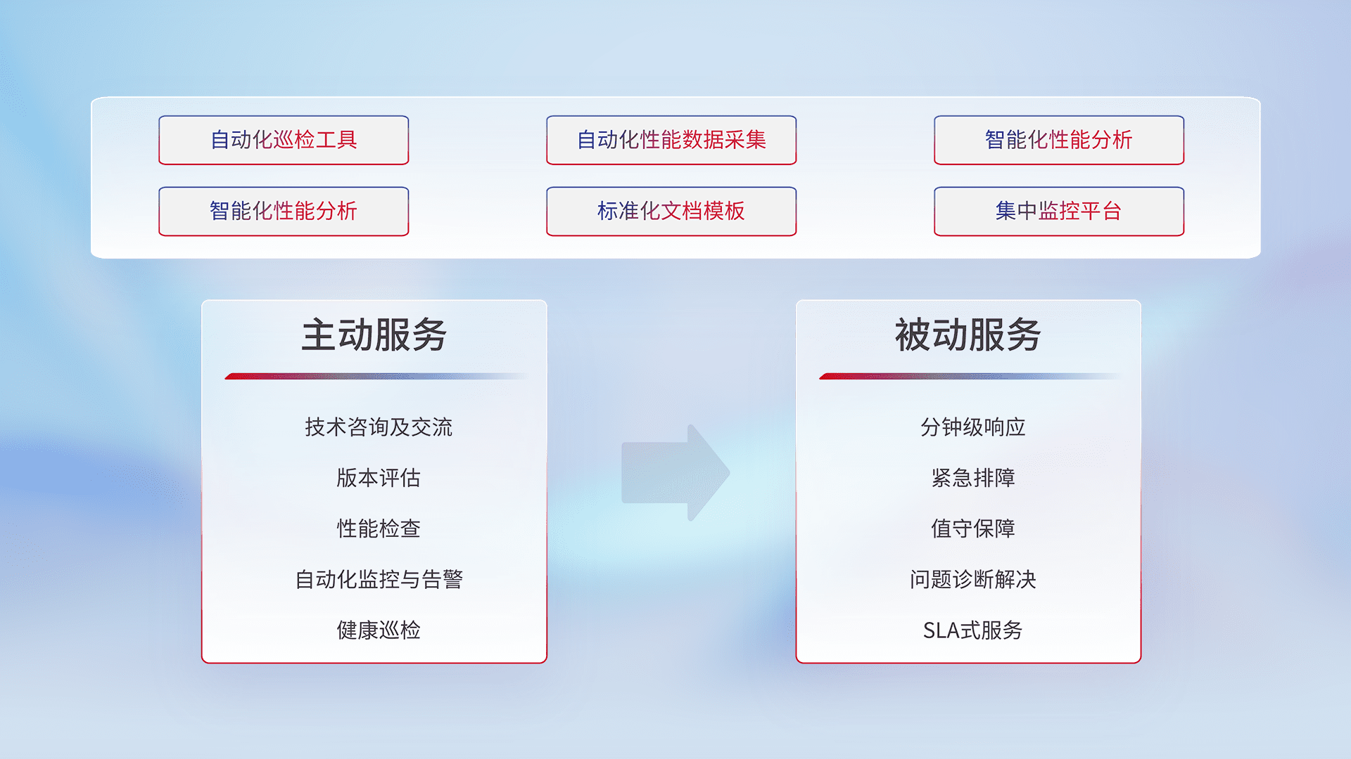 智能化工具和标准化文档,,,,保障服务质量,,,提供主动服务(包含技术咨询、、、版本评估、、、性能检查、、、自动化监控与告警、、、健康巡检)和被动服务包含(分钟级响应、、、紧急排障、、、、值守保障、、问题诊断解决、、、、SLA服务)。。